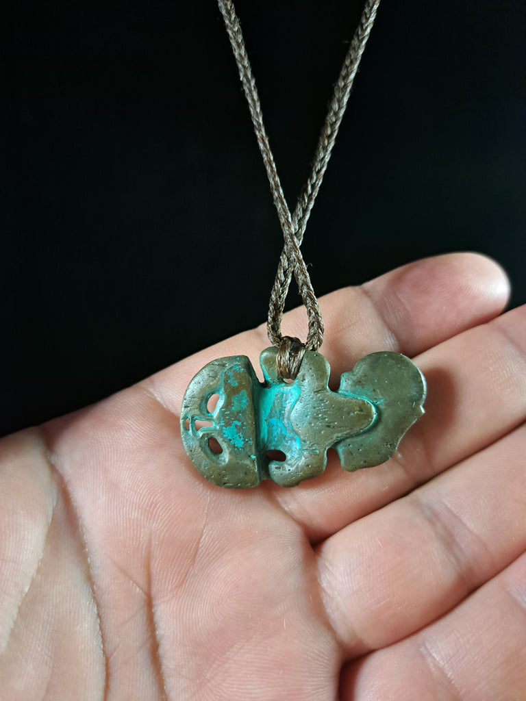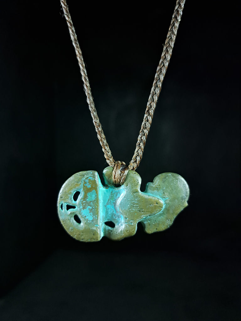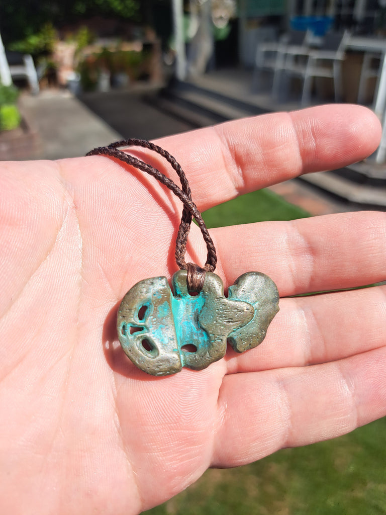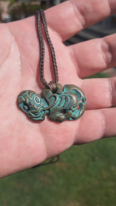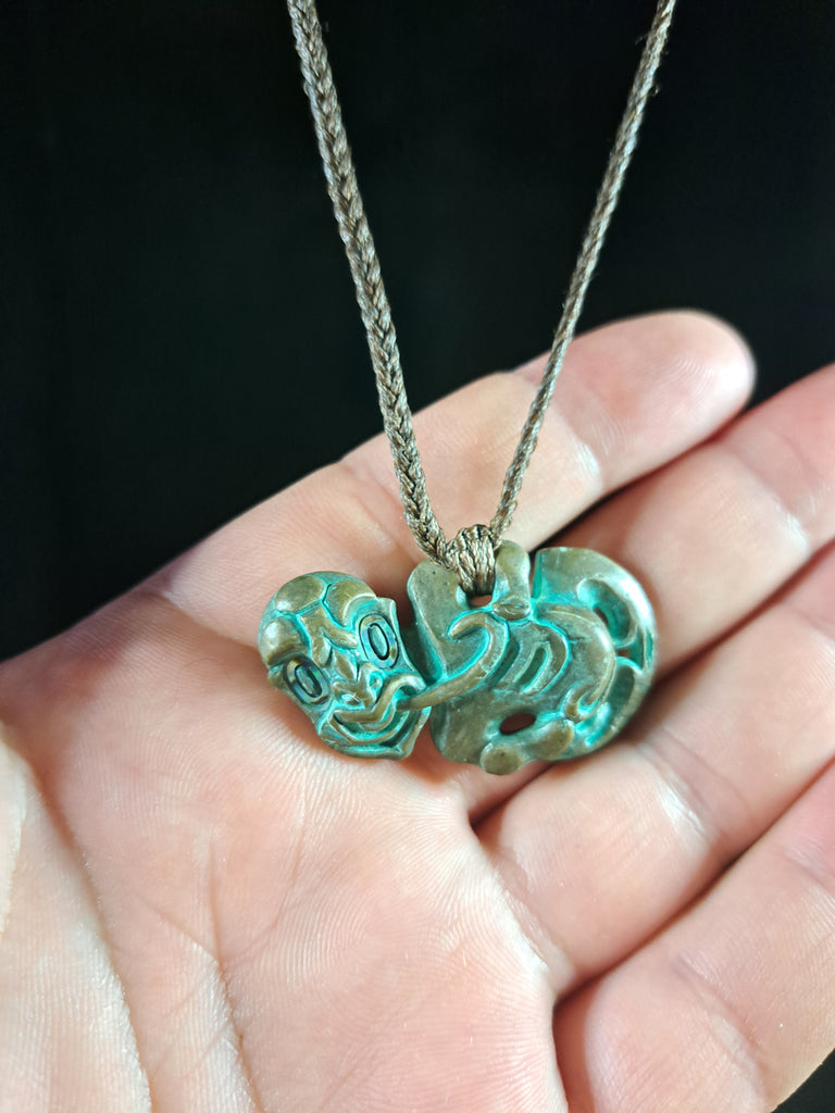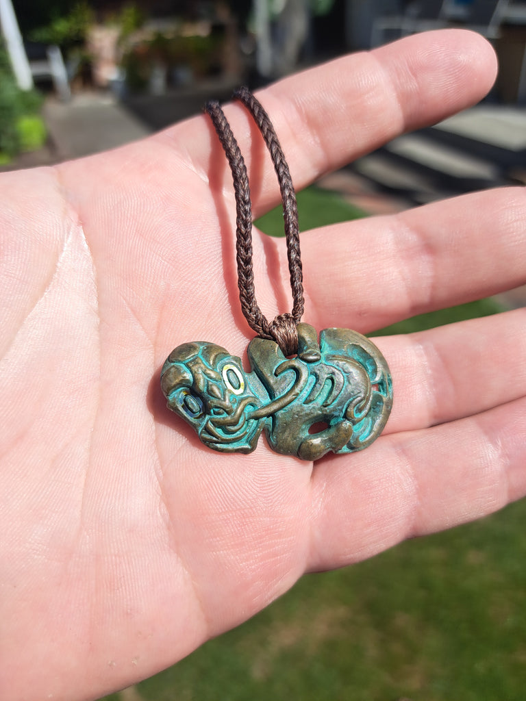 This Hei Tiki has been cast into Bronze (Silicon Brass) from a Whalebone Hei Tiki that I hand-carved. I have then changed the colour of the Bronze using chemicals to create a 'patina', which is similar to an oxidized layer on the Bronze itself - kind of like a colourful rust.