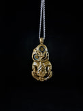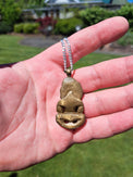 This Hei Tiki has been cast into Bronze (Silicon Brass) from a Whalebone Hei Tiki that I hand-carved. I have then changed the colour of the Bronze using chemicals to create a 'patina', which is similar to an oxidized layer on the Bronze itself - kind of like a colourful rust.