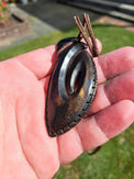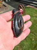 This Matau is made from a very interesting piece of Dinosaur Bone - also known as Gembone, or Agataized Gembone. Given the very porous nature of many dinosaur bones, and how long they have been fossilized for, sometimes Agate has formed in the pores on the inside of the bone - this is where we can see the change in colour happening.